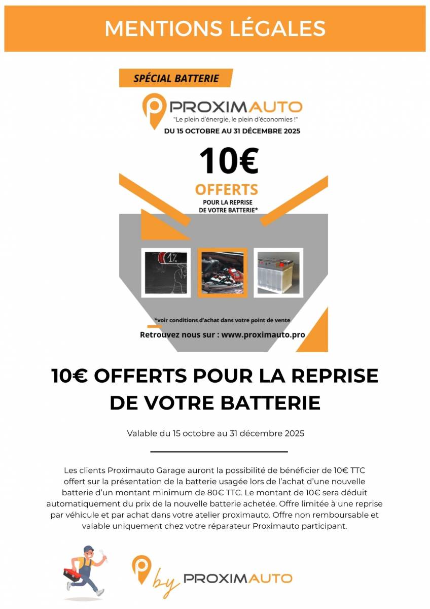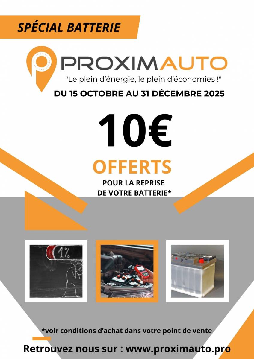 Les clients Proximauto Garage bénéficient d’une remise immédiate de 10€ TTC sur l’achat d’une nouvelle batterie (valeur minimale de 80€ TTC) en rapportant leur ancienne batterie usagée.